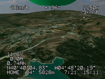 Shows aircraft position, heading and velocity vector, trajectory, home position, altitude, speed, map scale, etc.